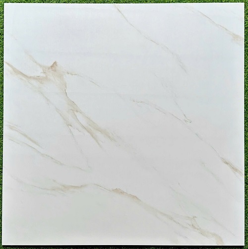 Trên bề mặt viên gạch bóng kiếng 120x120, từng đường vân xám hiện lên mảnh mai như vệ sương trên mặt đá, vừa tự nhiên vừa sang trọng. Màu trắng không chói gắt mà có độ mịn dịu, khiến ánh sáng phản chiếu mềm mại, lan tỏa đều khắp căn phòng.